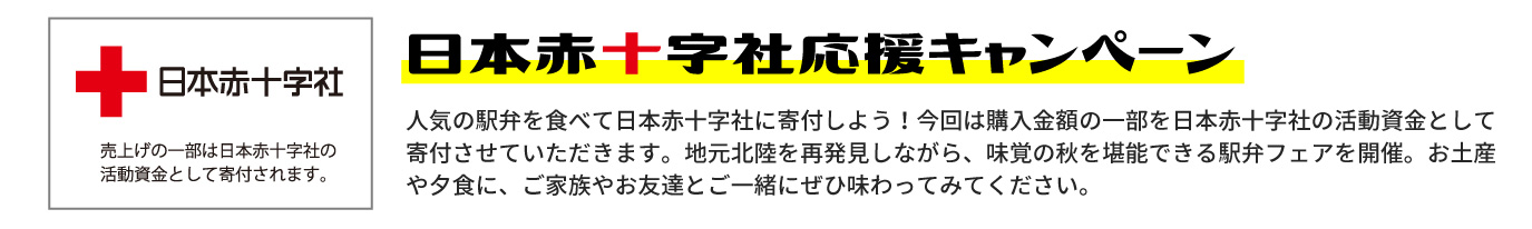 普段食べることのない地元北陸の駅弁を味わってみてはいかがでしょうか?また、駅弁まつりではご購入いただいた売上の一部を日本赤十字社へ寄付をするパートナーシップとしての日本赤十字社へ支援をいたします。