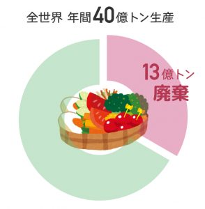 全世界で食品ロスが大きな問題となっています。世界で生産される食品40億トンのうち13億トンが食品ロスとなっています。これは、全生産量の3分の1が捨てられていることを表しています。このような悲しい事態を防ぎ、改善するには消費者・生産者・業者のそれぞれが意識をもち、食品ロスをなくす取り組みを行なっていく必要があります。