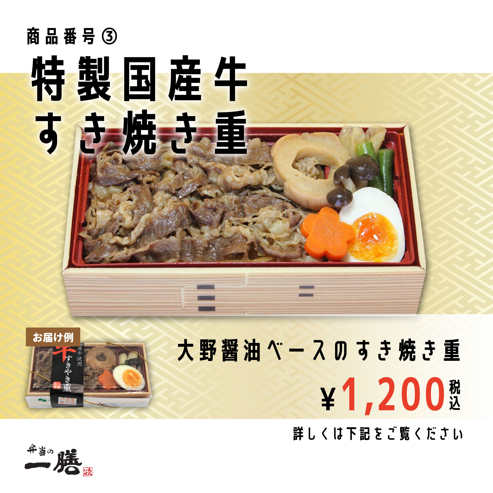 商品番号③ 特製国産牛すき焼き重 税込1,200円
