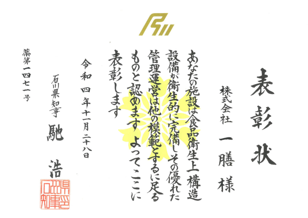 11月28日付けにて株式会社一膳が、石川県食品衛生協会主催の令和4年度食品衛生功労者及び食品衛生優良施設知事表彰においてその施設内容及び衛生管理が特に優秀で、他の模範となる施設として「石川県知事表彰」を受賞しました。