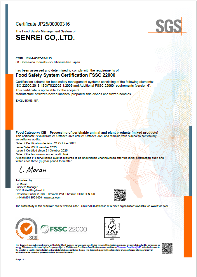 このたび、㈱SENREI(以下、当社)は、食品安全マネジメントシステムの国際的な認証規格であるFSSC 22000(Food Safety System Certification 22000)の認証を取得いたしましたことをご報告申し上げます。